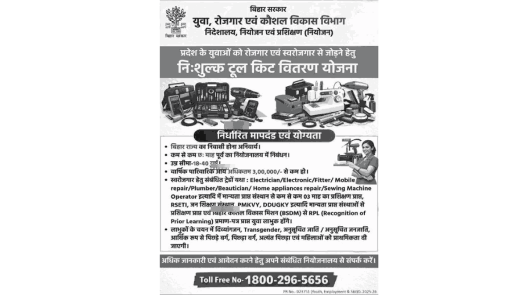 यह Bihar Govt Free Toolkit Scheme 2026 योजना राज्य के रोजगार और उद्यमिता क्षेत्र को मजबूती देने की दिशा में एक अहम कदम है।