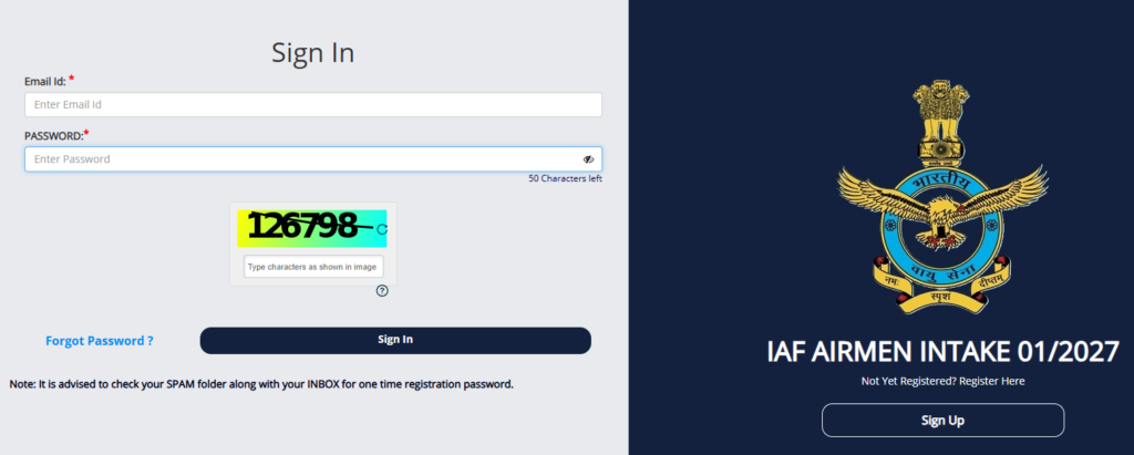• Step 3 – फिर नया पेज ओपेन होगा अगर आपने पहले से अकाउन्ट बनाया हुआ है तो लोग इन करें अगर नहीं बनाया तो IAF AIRMEN INTAKE 01/2027 Not yet Registration? Register Here के नीचे Sing Up का ऑप्शन मिल जायेंगे उस पर क्लिक करें