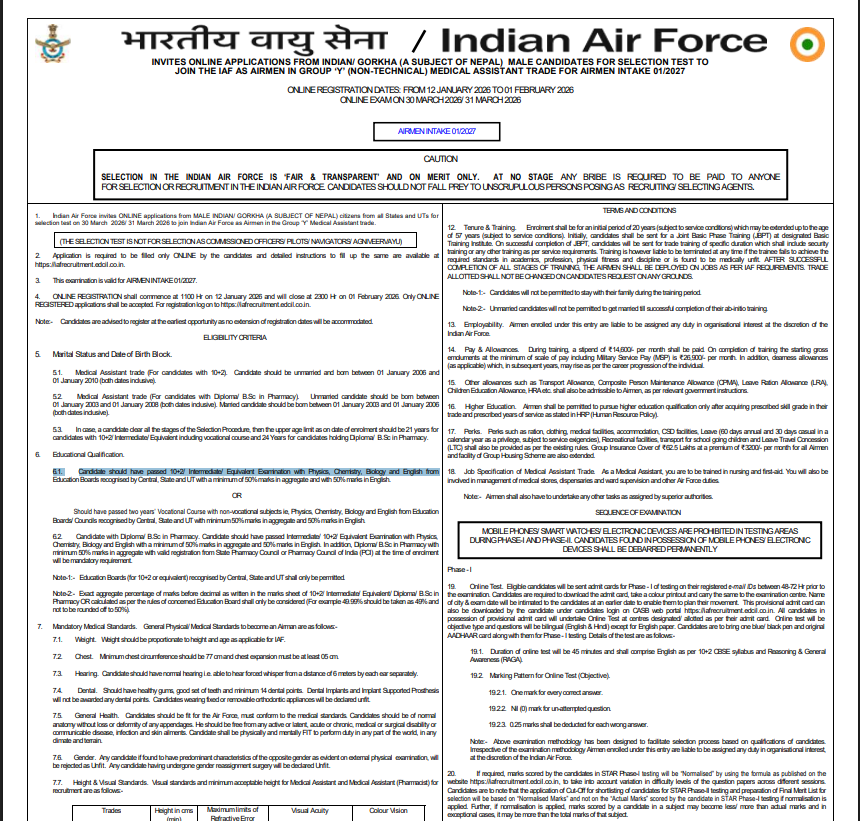 यह भारतीय वायुसेना की भर्ती है जिसमें Group Y ( Non technical ) Medical assistant ट्रेड के लिए Airman Intake 01/2027 के तहत उम्मीदवारों का चयन किया जाता है