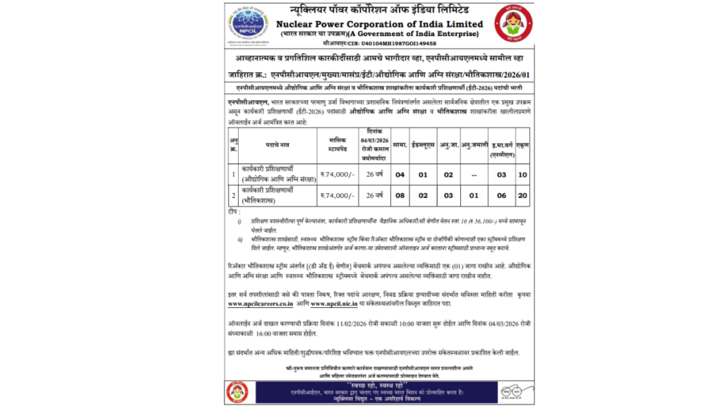 NPCIL Executive Trainee Vacancy 2026 के लिए कार्यकारी प्रशिक्षु (Executive Trainee) पदों पर भर्ती का आधिकारिक नोटिफिकेशन जारी कर दिया है। इस भर्ती के माध्यम से कुल 30 रिक्तियों को भरा जाएगा, जिसमें इंजीनियरिंग और विज्ञान के क्षेत्रों के योग्य उम्मीदवारों को अवसर दिया जाएगा। यह भर्ती उन युवाओं के लिए महत्वपूर्ण है जो वैज्ञानिक व तकनीकी क्षेत्रों में केंद्र सरकार के अधीन कार्य करना चाहते हैं।