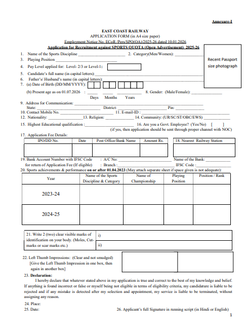 3. क्लिक करते ही Railway Sports Quota Notification 2026 के लिए आवेदन फॉर्म ओपेन हो जायेंगे इस फार्म को डाउनलोड करके प्रिंट कर ले