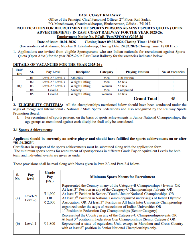 आपकी जानकारी के लिए बता दें कि इस भर्ती के लिए आवेदन 9 जनवरी 2026 से शुरू हो गए हैं और जो भी इच्छुक और योग्य उम्मीदवार है वे इन पदों के लिए 9 फरवरी 2026 शाम 6:00 बजे तक आवेदन कर सकते हैं अगर आप अण्डमान और निकोबार या लक्षद्वीप से है तो आपके लिए अंतिम तिथि 24 फरवरी 2026 तक की है यह उन खिलाड़ियों के लिए अच्छा मौका है जो रेलवे जैसे क्षेत्र में सरकारी नौकरी ढूँढ रहे थे यह भर्ती Level 2/3 और Level 1 के लिए है जिसमे Athletics,Weight Lifiting और Archery जैसे खेल शामिल हैं