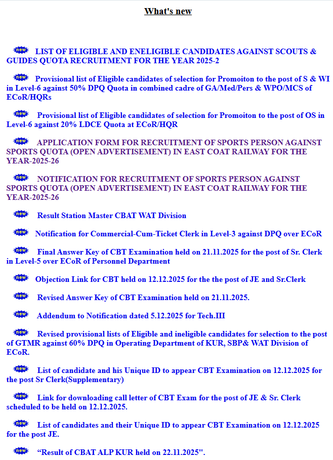 2. होम पेज पर ही आपको थोड़ा सा नीचे स्क्रॉल करने पर What,s New सेक्शन में आपको Application Form for Requirement Of sports Persons Against Sports quota (OPEN ADVERTISEMENT) In East Coast Railway For the year 2025-26 के लिंक पर क्लिक करें